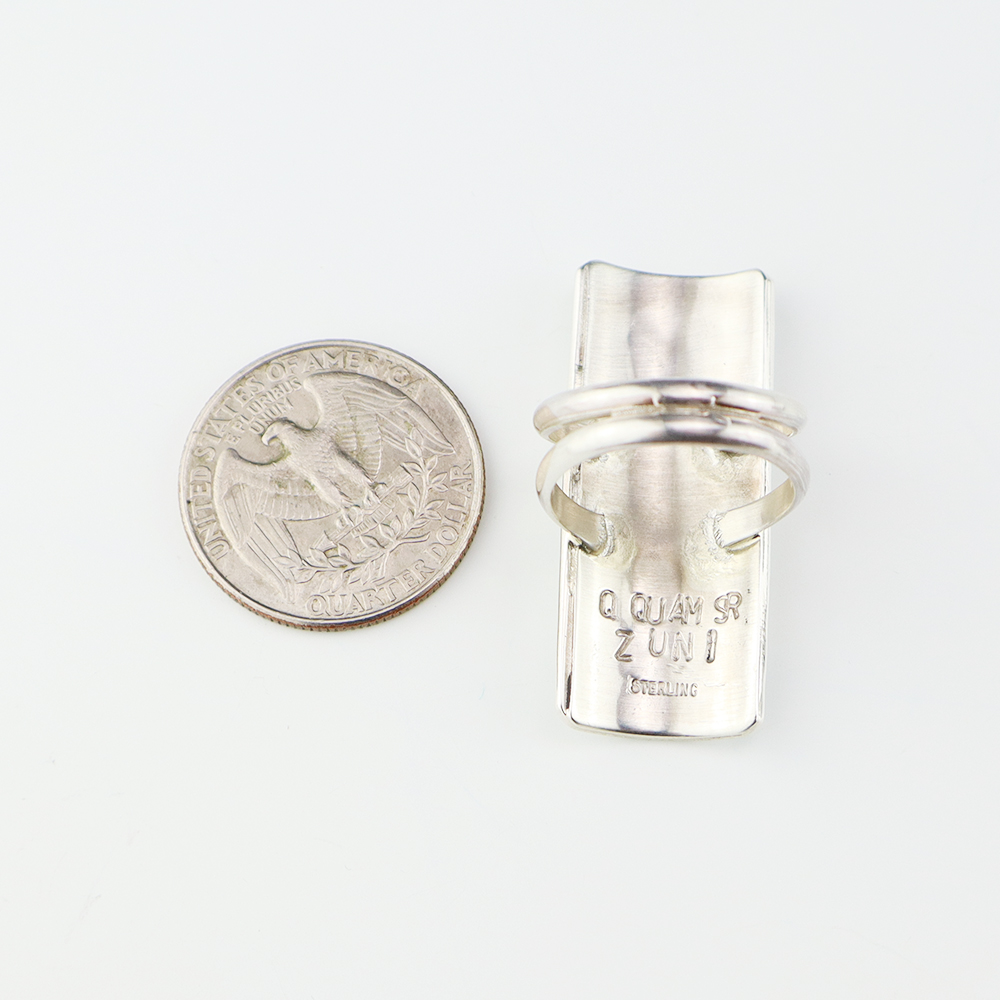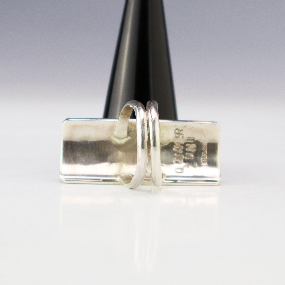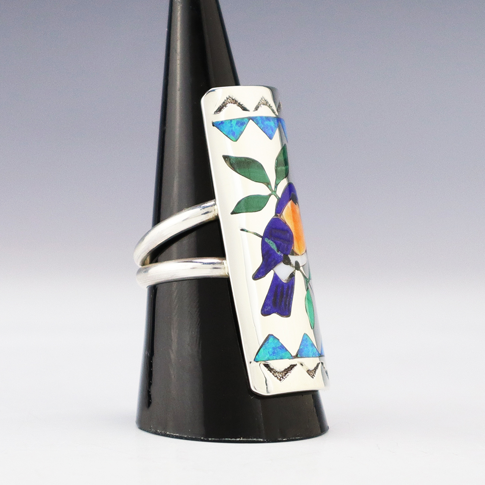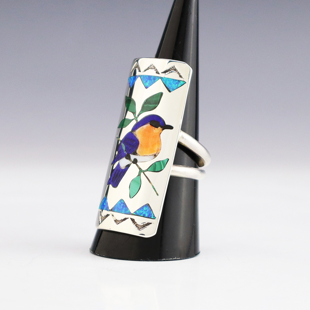 Amazing inlay work! Zuni jewelry makers, Nancy and Sheldon Westika created this magnificent ring. Made out of sterling silver and inlaid with Kingman Turquoise and Jet. Zuni artists are known for their lapidary work. The Westikas have been making jewelry since the 1970’s and they are known for their fine...