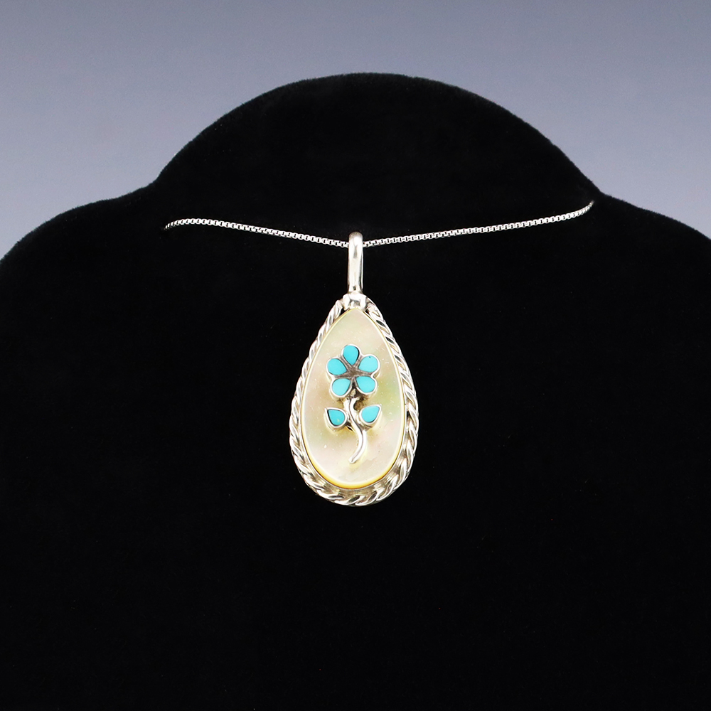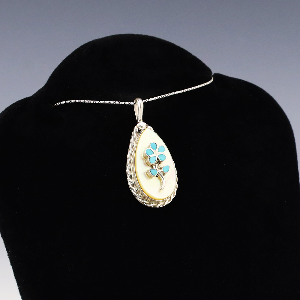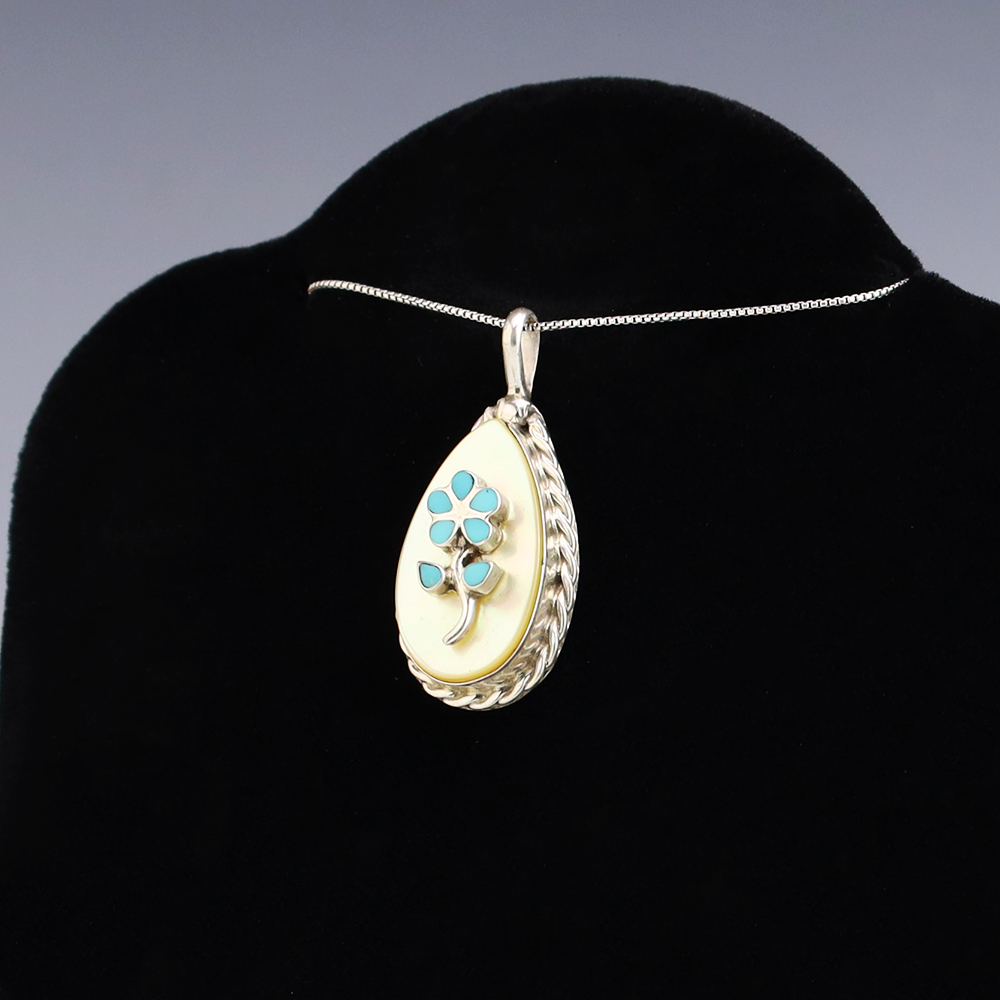 Zuni artists are known for their fine lapidary skills. This cross pendant is no exception. Zuni artist Rodney Lasiloo made this pendant out of sterling silver and inlaid it with Turquoise and Mother of Pearl Shell. Weighs 4 grams. (Chain not included) Signed.