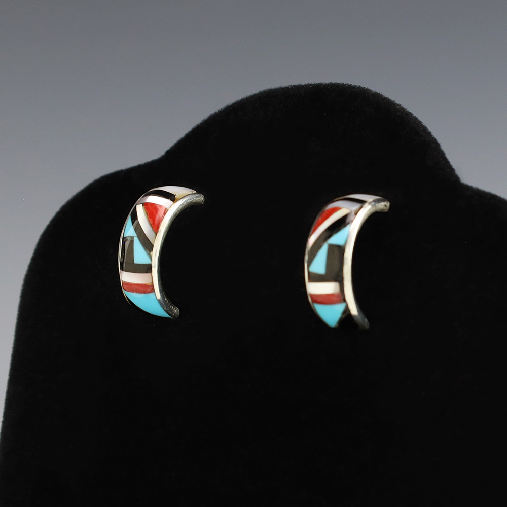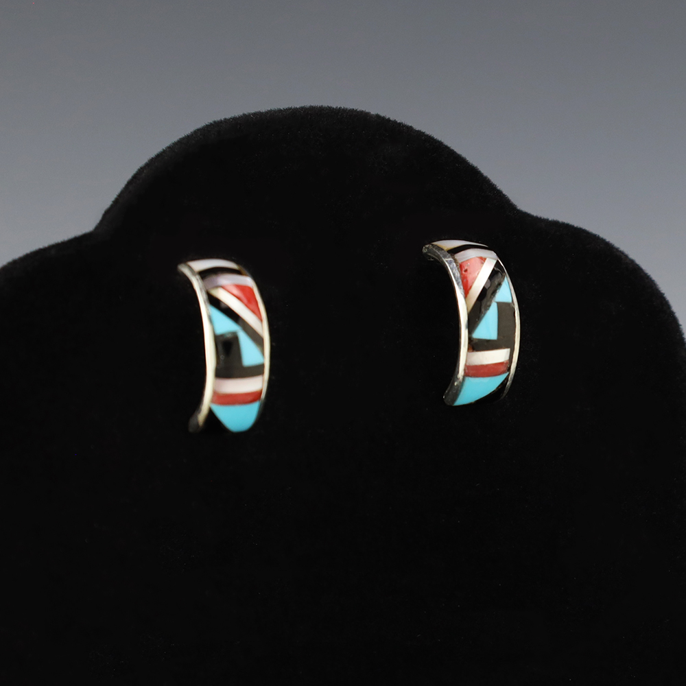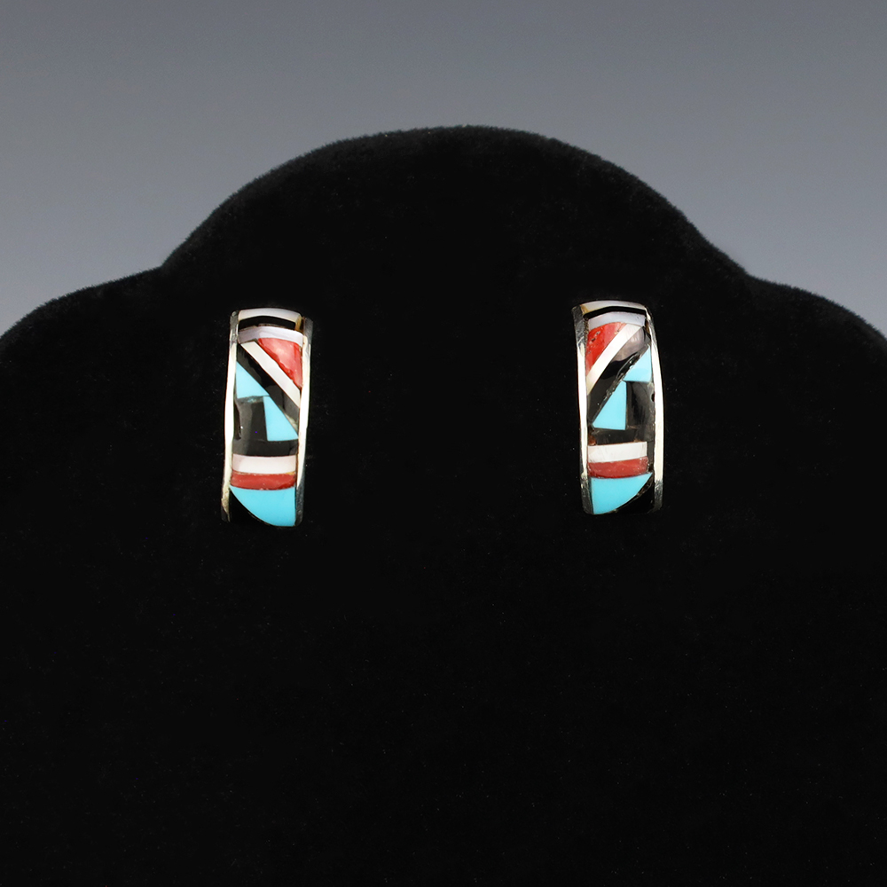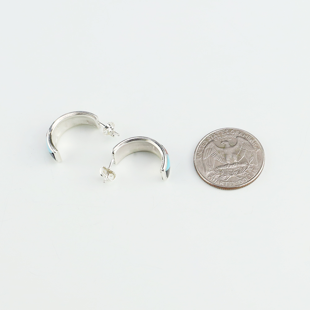 Zuni jewelry artist Delberta Boone hand made these lovely hoop earrings. Made out of sterling silver and inlaid with Turquoise, Coral, Jet, and Mother of Pearl Shell. Weighs 4 grams. Signed