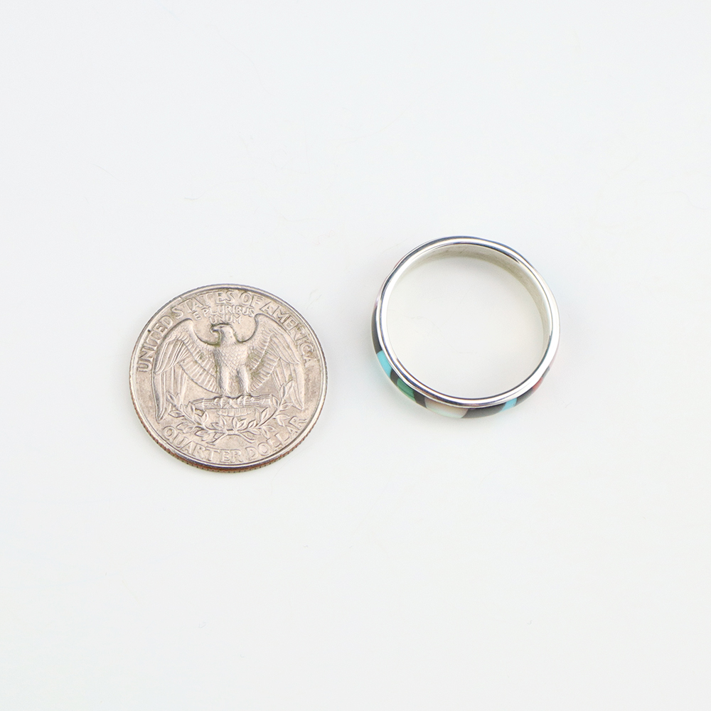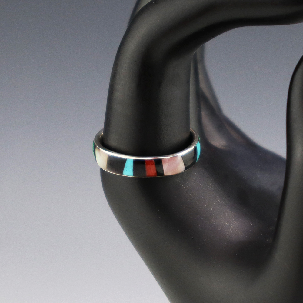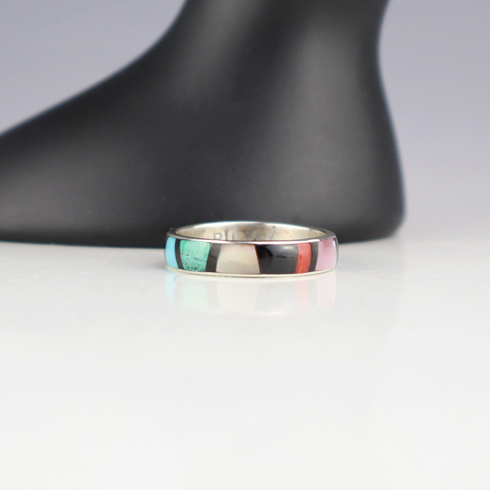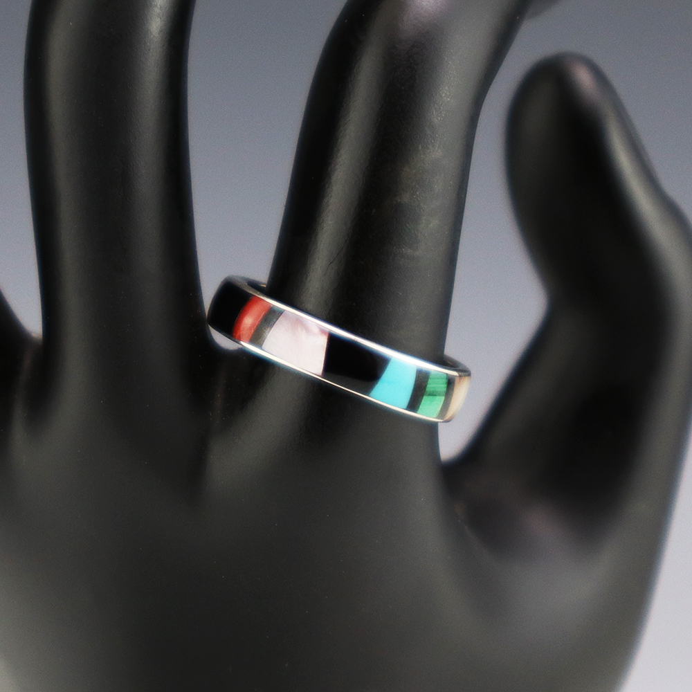 Zuni artists are known for their fine lapidary skills. Each stone is hand cut, polished, and set into a sterling silver setting. The ring is set with Mother of Pearl Shell, Jet, Coral, Pink Mussel, Malachite, and Turquoise stones. Hand made by Zuni artist Rosewitha Ukestine. Weighs 2 grams. Size 10. Signed
