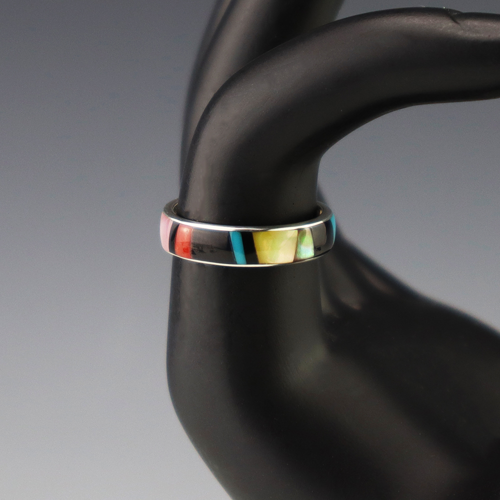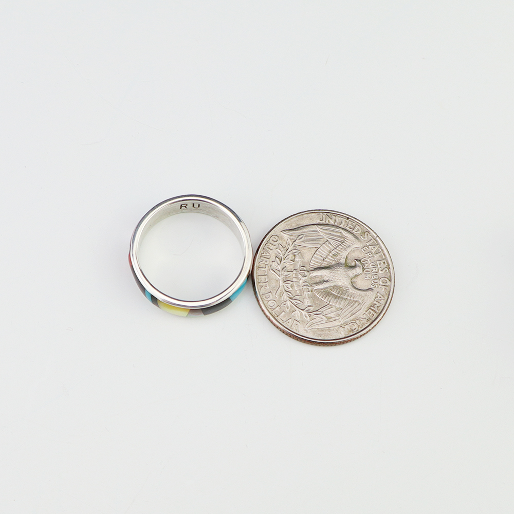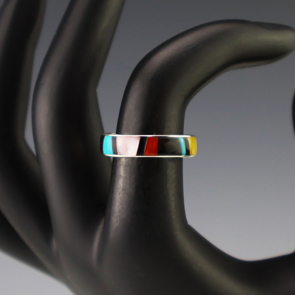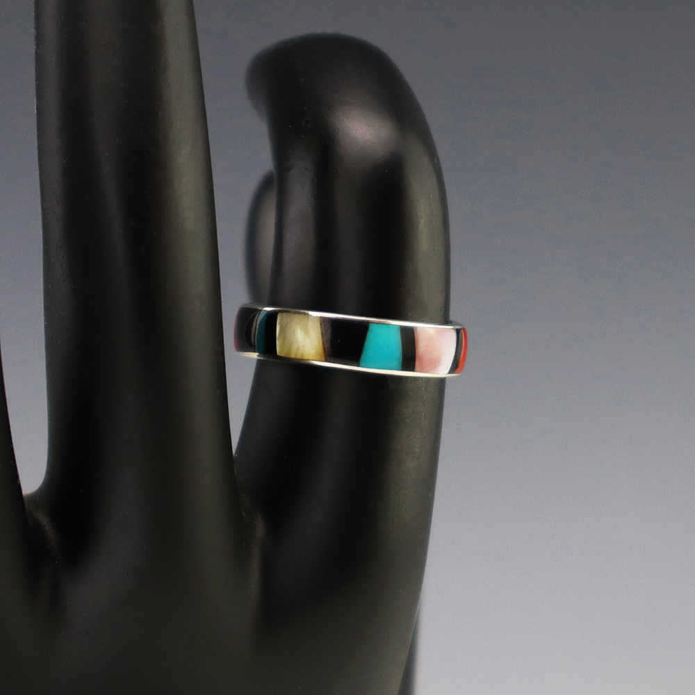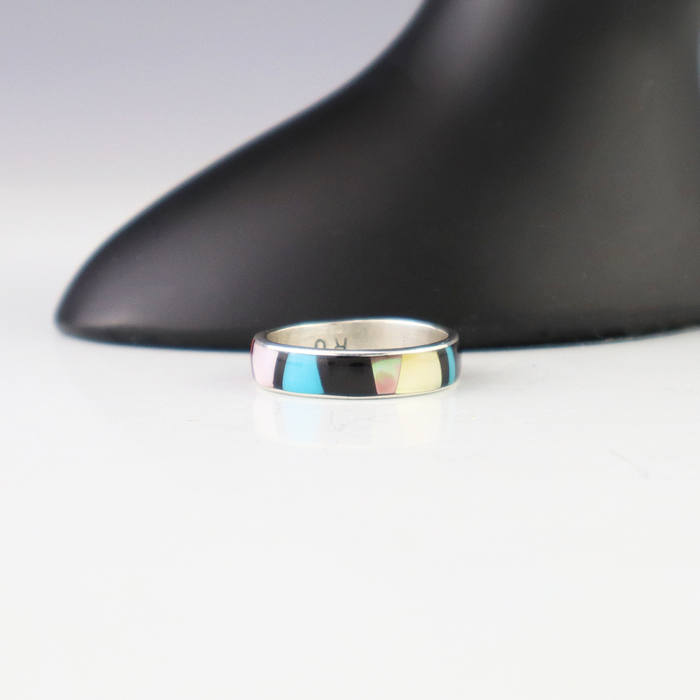 Zuni artists are known for their fine lapidary skills. Each stone is hand cut, polished, and set into a sterling silver setting. The ring is set with Mother of Pearl Shell, Pink Mussel, Jet, Coral, and Turquoise stones. Hand made by Zuni artist Rosewitha Ukestine. Weighs 2 grams. Size 7. Signed