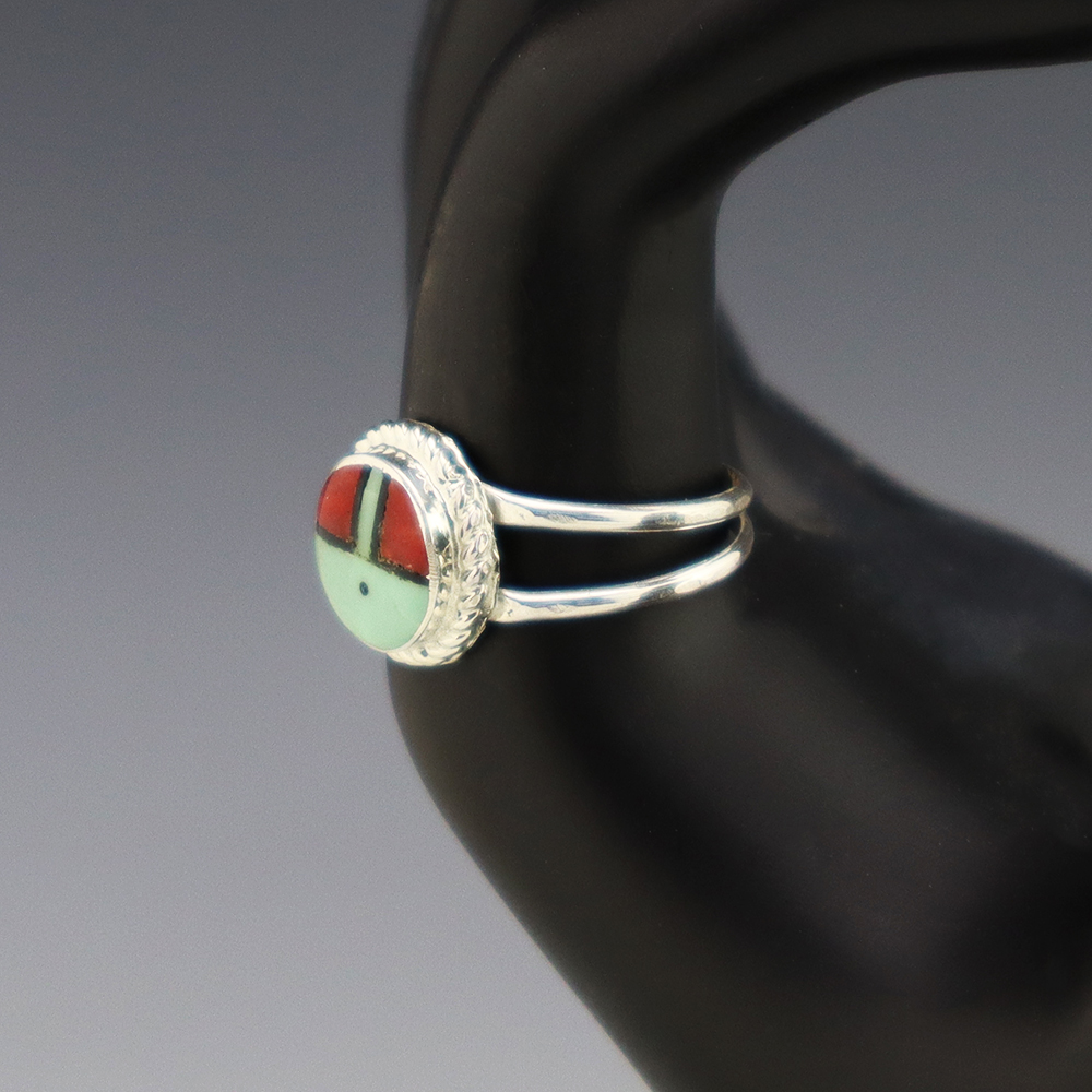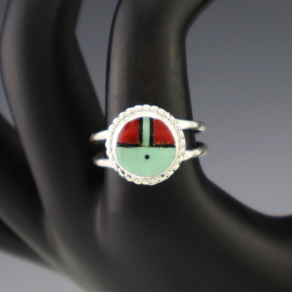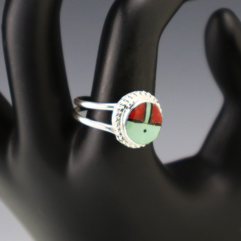 Zuni artist Ola Eriacho made this lovely Sun Face ring out of sterling silver, Coral, Jet, and Turquoise. Weighs 4 grams. Size 9. Signed.