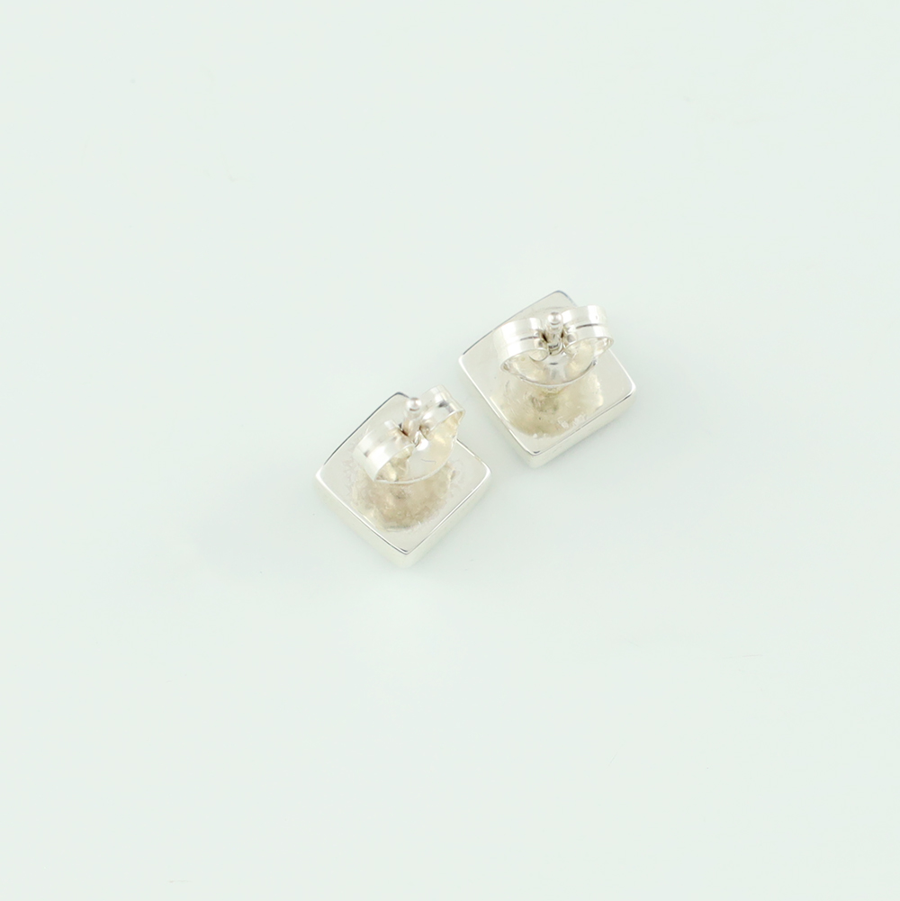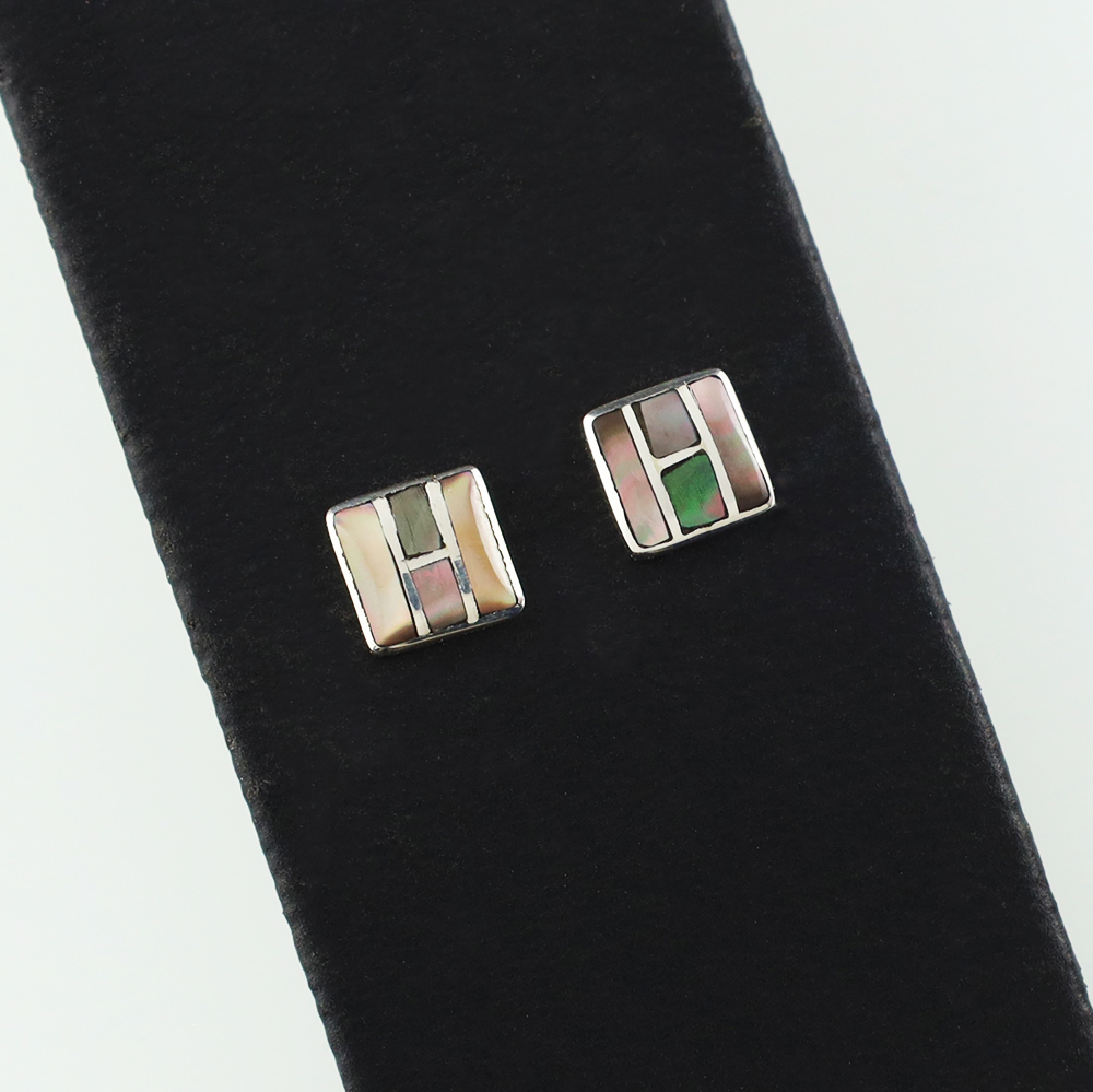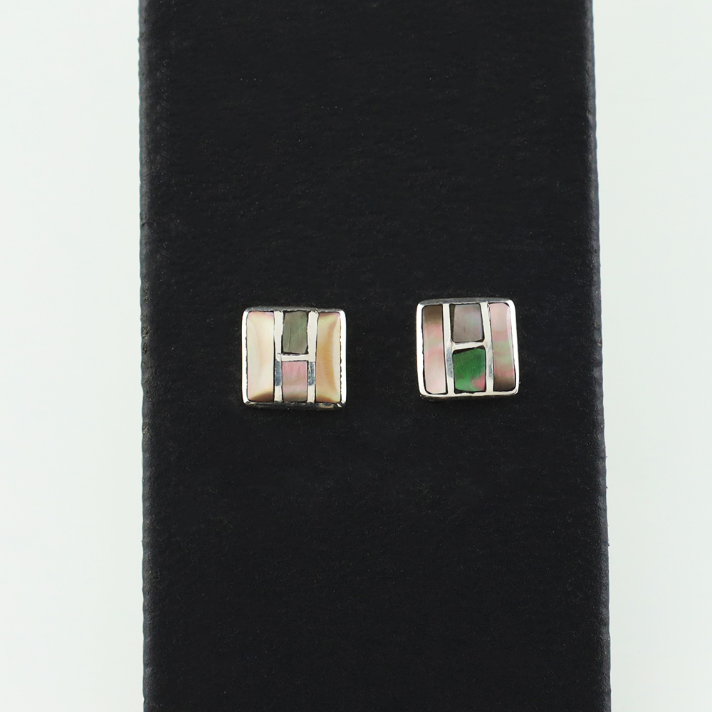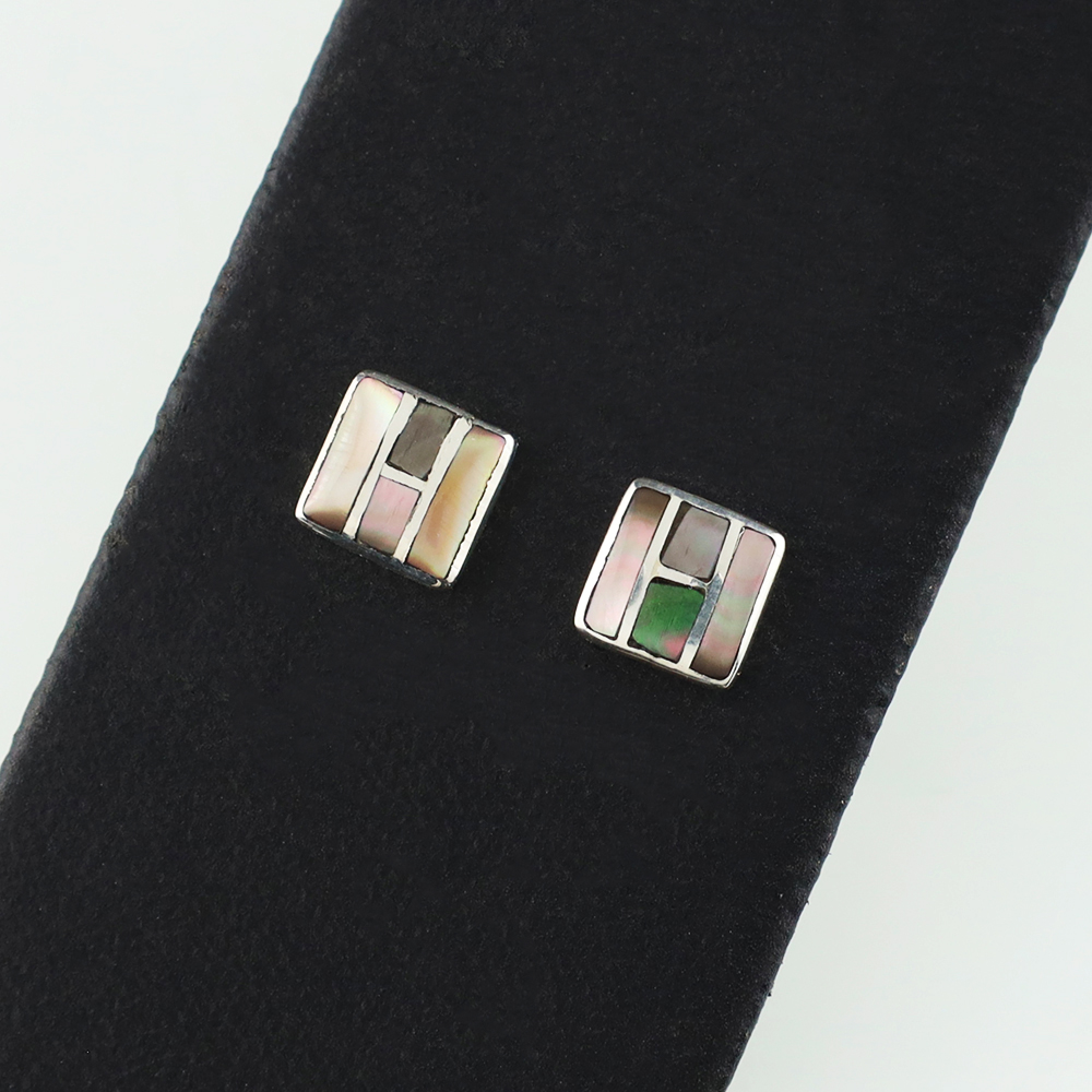 Zuni artists Nancy and Sheldon Westika hand made these exquisite earrings. Made out of sterling silver and inlaid with Mother of Pearl Shell. Zuni artists are known for their lapidary work. The Westikas have been making jewelry since the 1970’s and they are known for their fine inlay work. Weighs 2 grams.