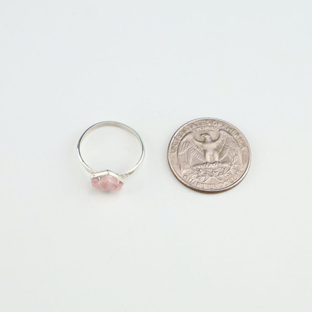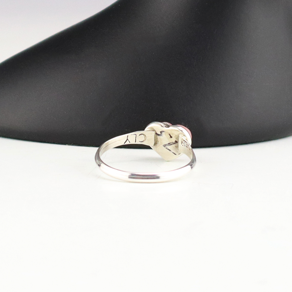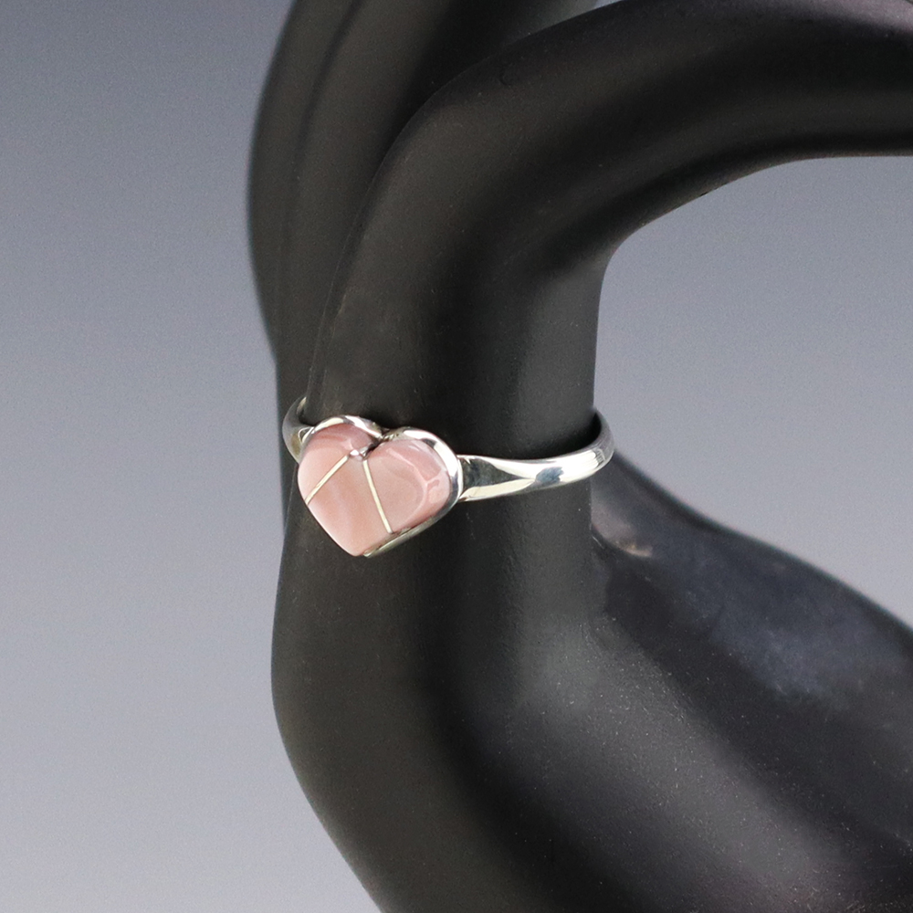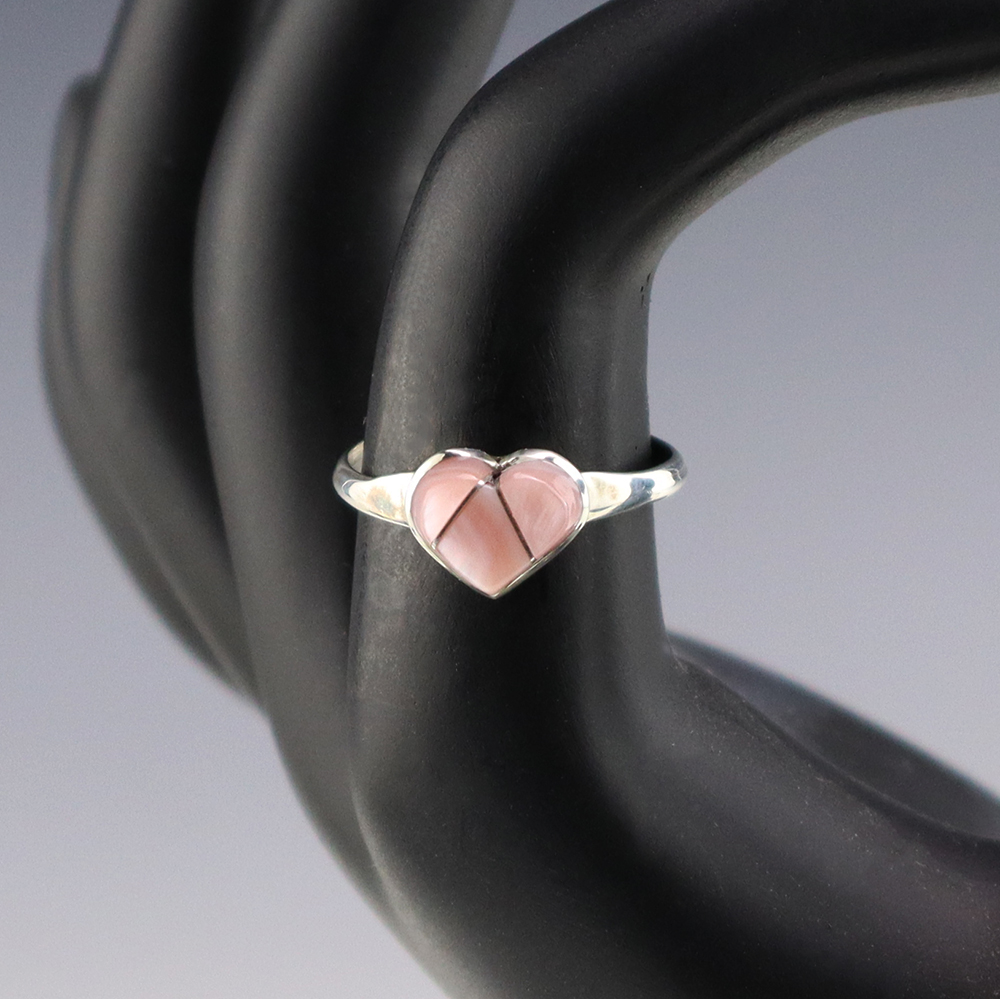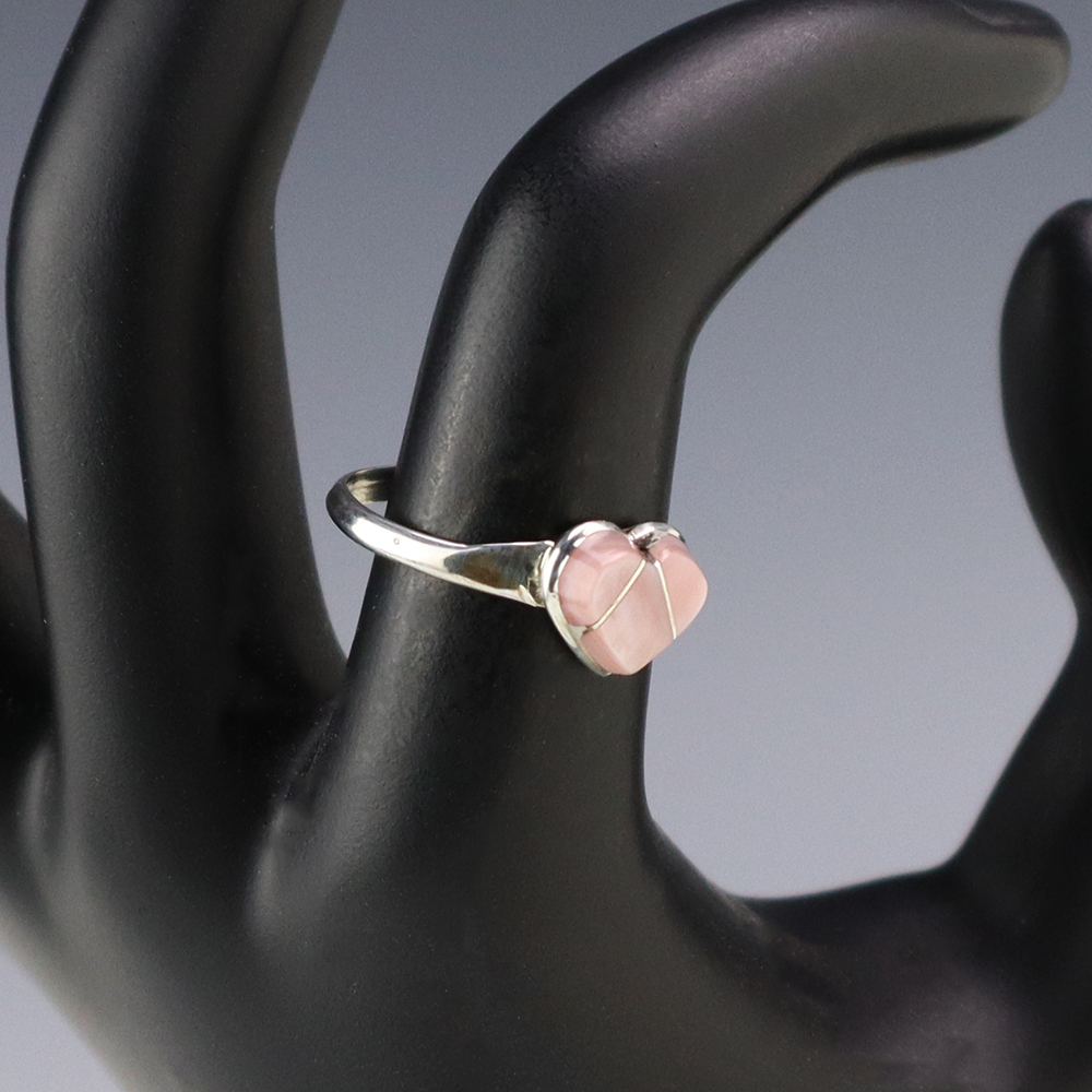 Zuni artists are known for their fine lapidary skills. Each stone is hand cut, polished, and set into a sterling silver setting. The ring is set with Pink Mussel stones. Hand made by Zuni artist John Cly. Weighs 2 grams. Size 7 1/2. Signed