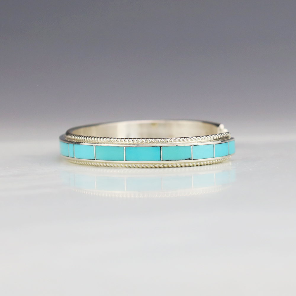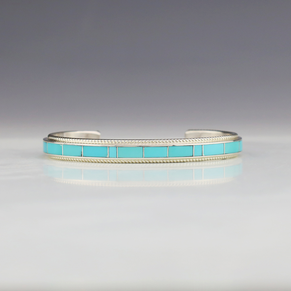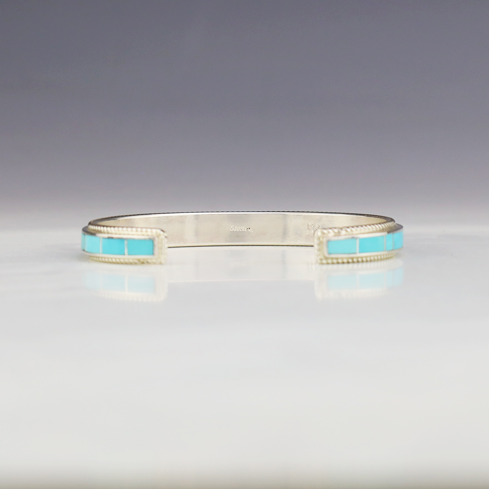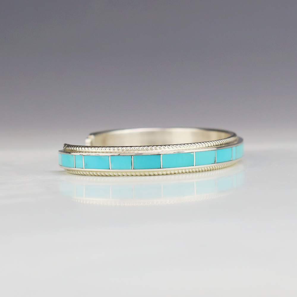 Zuni artist Ricky Booqua made this lovely bracelet. Zuni artists are known for their fine lapidary skills. Each stone is hand cut, polished, and set into a sterling silver setting. The bracelet is sterling silver and inlaid with Turquoise. Weighs 20 grams. Signed.