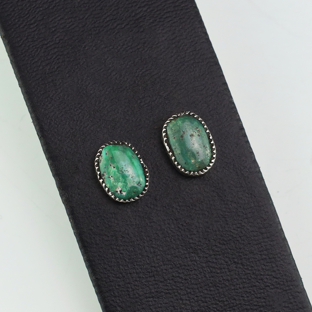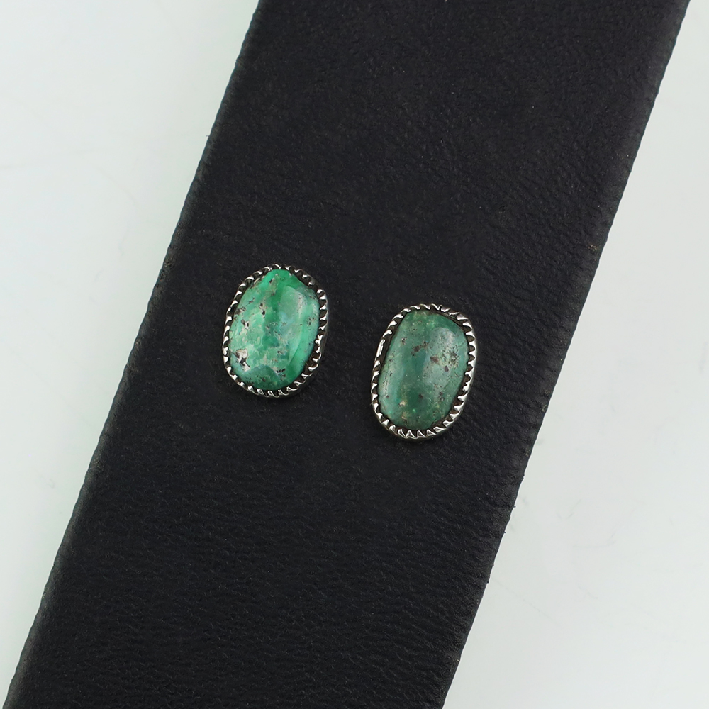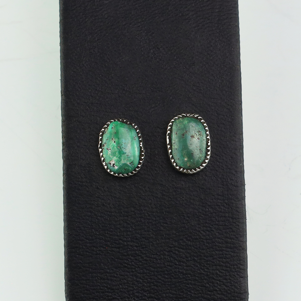 Zuni artist, Diane Lonjose created these lovely earrings. Made out of sterling silver and set with natural Kingman Turquoise. The components are all hand fabricated and the stones are all natural. Diane comes from a family of Zuni jewelers. She is the daughter of Alice and Duane Quam, and grandchild of Doris and Wayne Ondelacy. Weighs 2 gram. Signed
