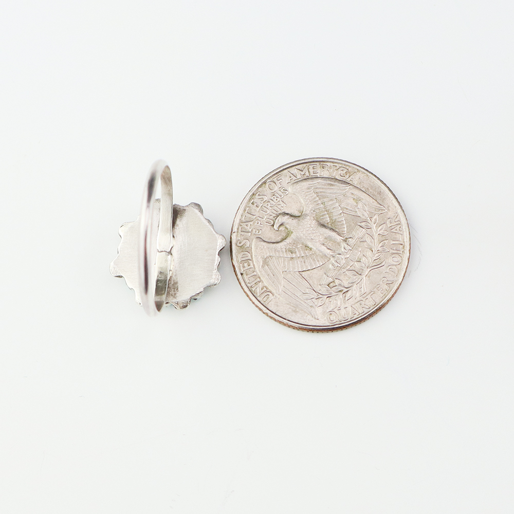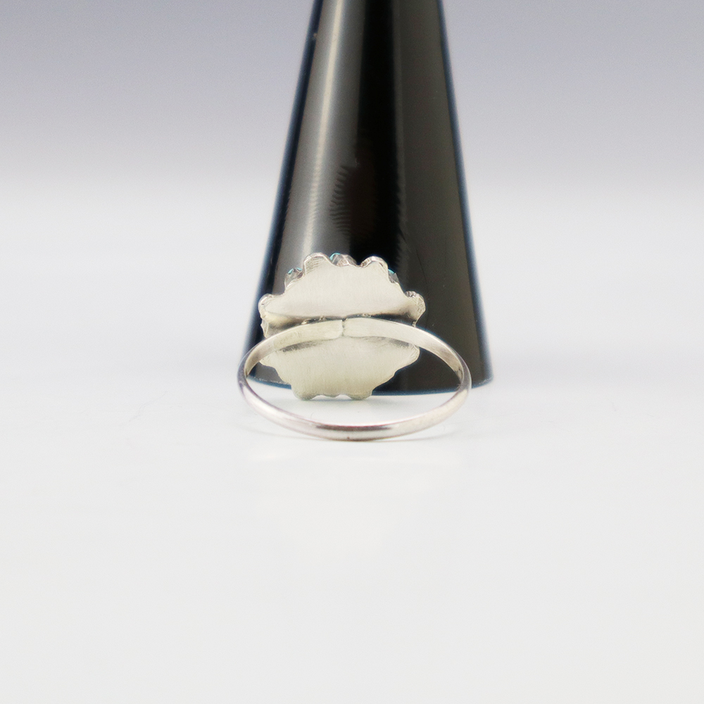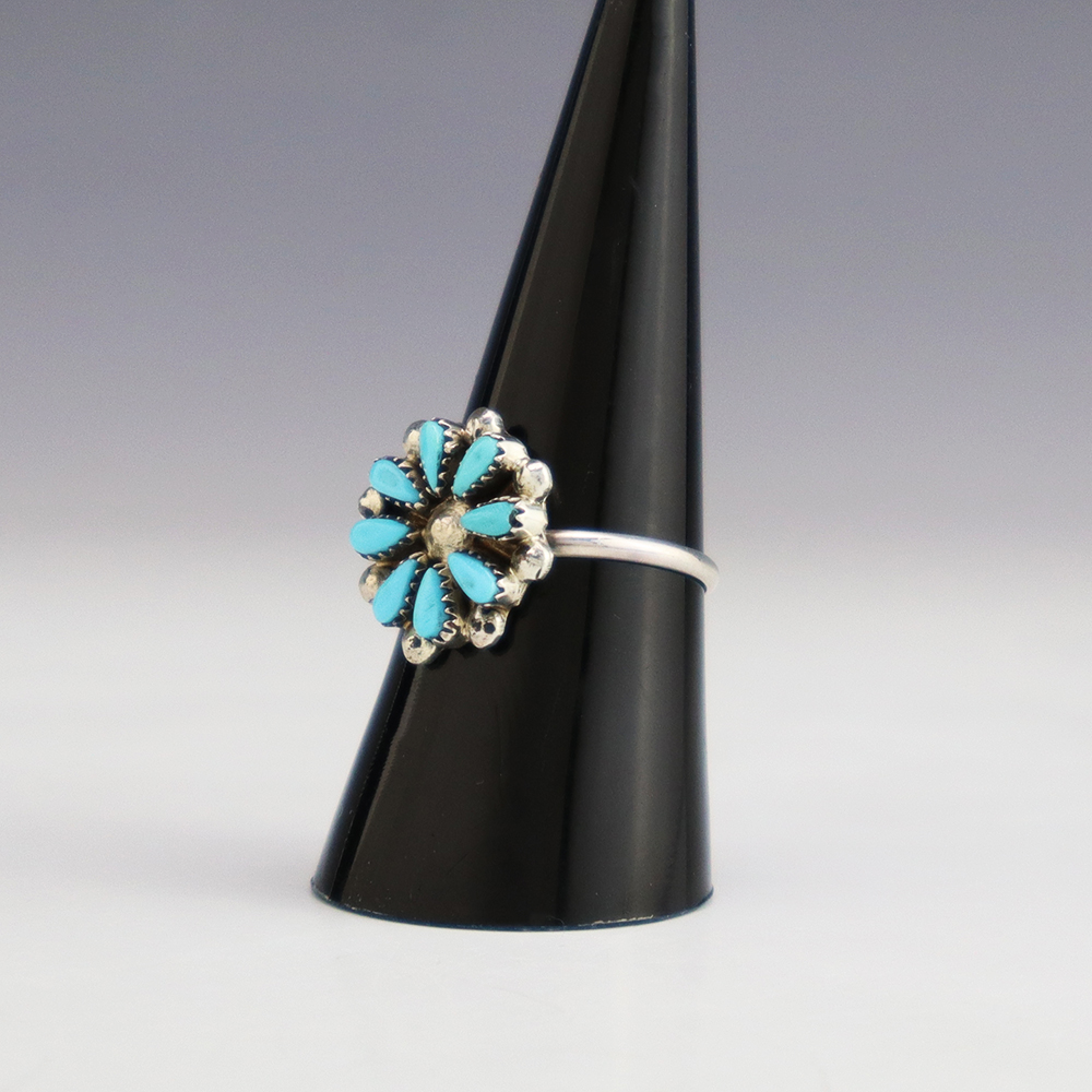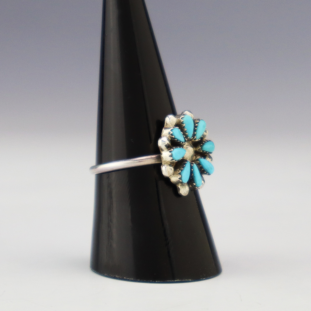 Zuni artists David and Sarita Leekity hand made this lovely ring out of sterling silver and Turquoise. Great petit point design! Weighs 4 grams. Size 7 3/4.