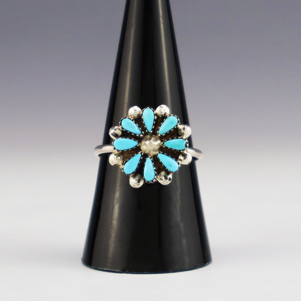 Zuni artists David and Sarita Leekity hand made this lovely ring out of sterling silver and Turquoise. Great petit point design! Weighs 4 grams. Size 7 3/4.