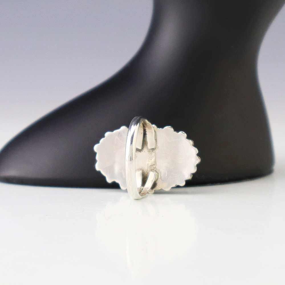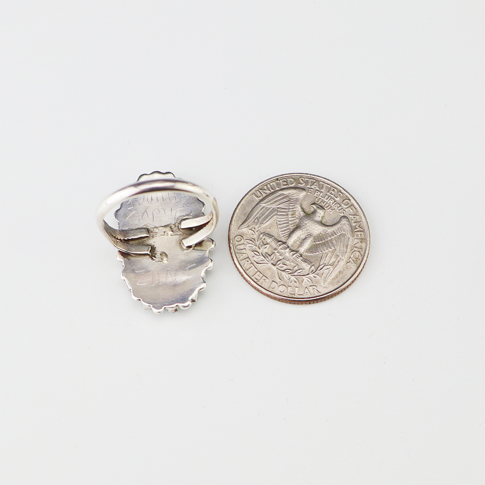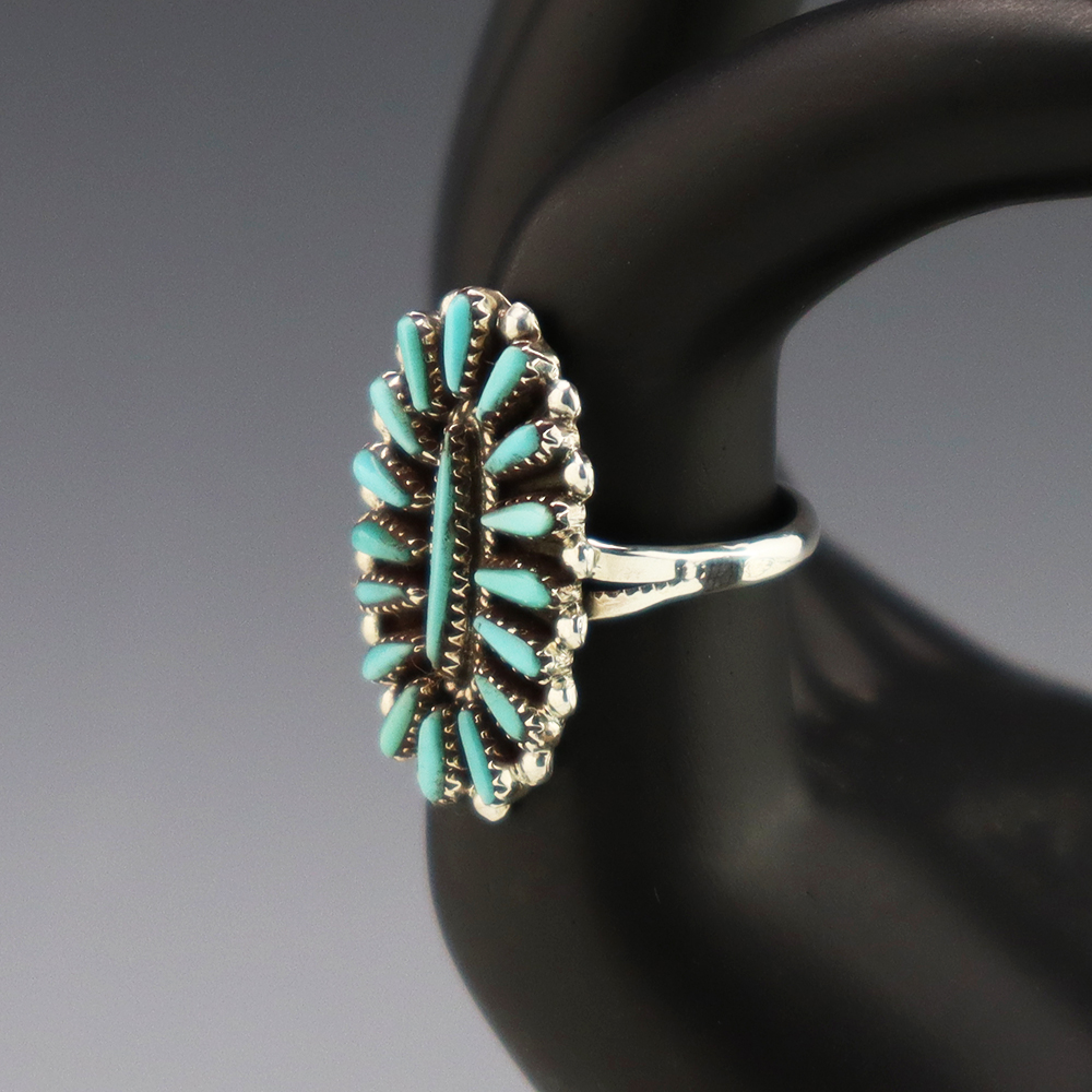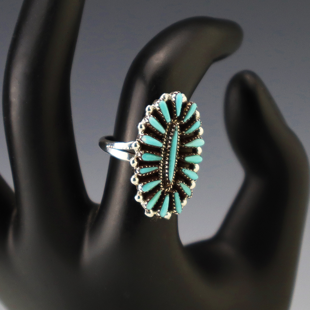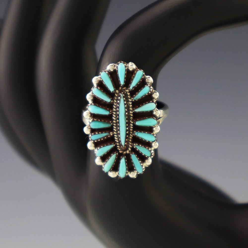 Zuni artist Judy Wallace made this beautiful ring out of sterling silver and Turquoise. Great needlepoint design! Weighs 6 grams. Size 7. Signed.