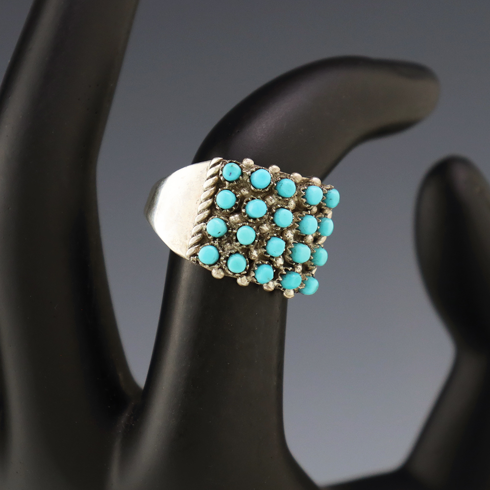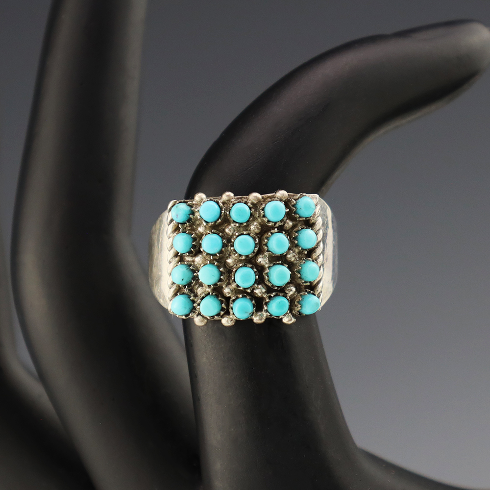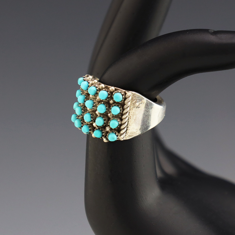 Amazing inlay work! Zuni jewelry makers, Nancy and Sheldon Westika made this stunning ring. Made out of sterling silver and inlaid with Kingman Turquoise and Jet. Zuni artists are known for their lapidary work. The Westikas have been making jewelry since the 1970’s and they are known for their fine...