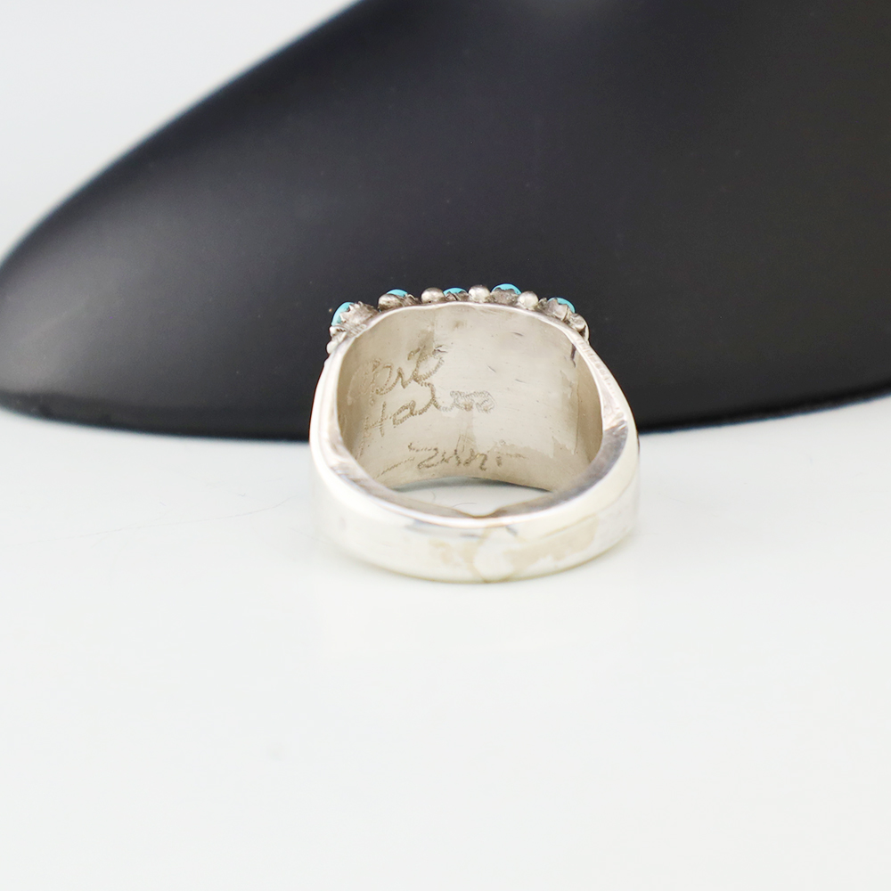 Amazing inlay work! Zuni jewelry makers, Nancy and Sheldon Westika created this magnificent ring. Made out of sterling silver and inlaid with Kingman Turquoise and Jet. Zuni artists are known for their lapidary work. The Westikas have been making jewelry since the 1970’s and they are known for their fine...