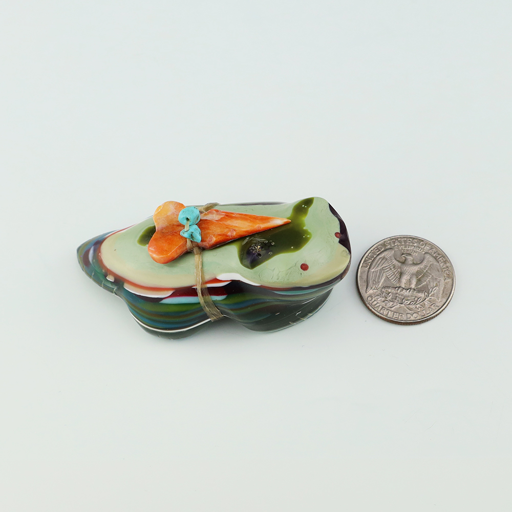Zuni Badger Fetishes represent the ability to reach a desired goal or aggressiveness and perseverance. Zuni fetish artists Leland Boone and Daphne Quam hand carved this wonderful badger out of Surfite and bundled it with Spiny Oyster and Turquoise.