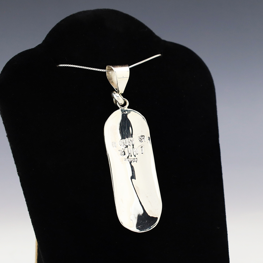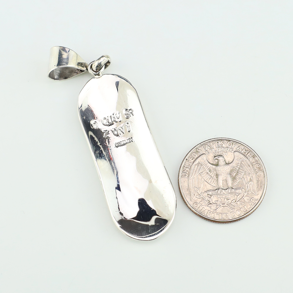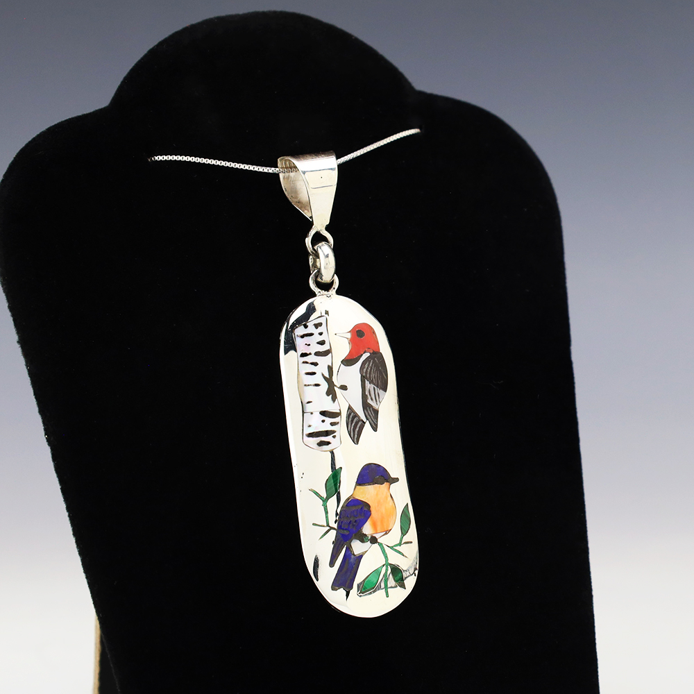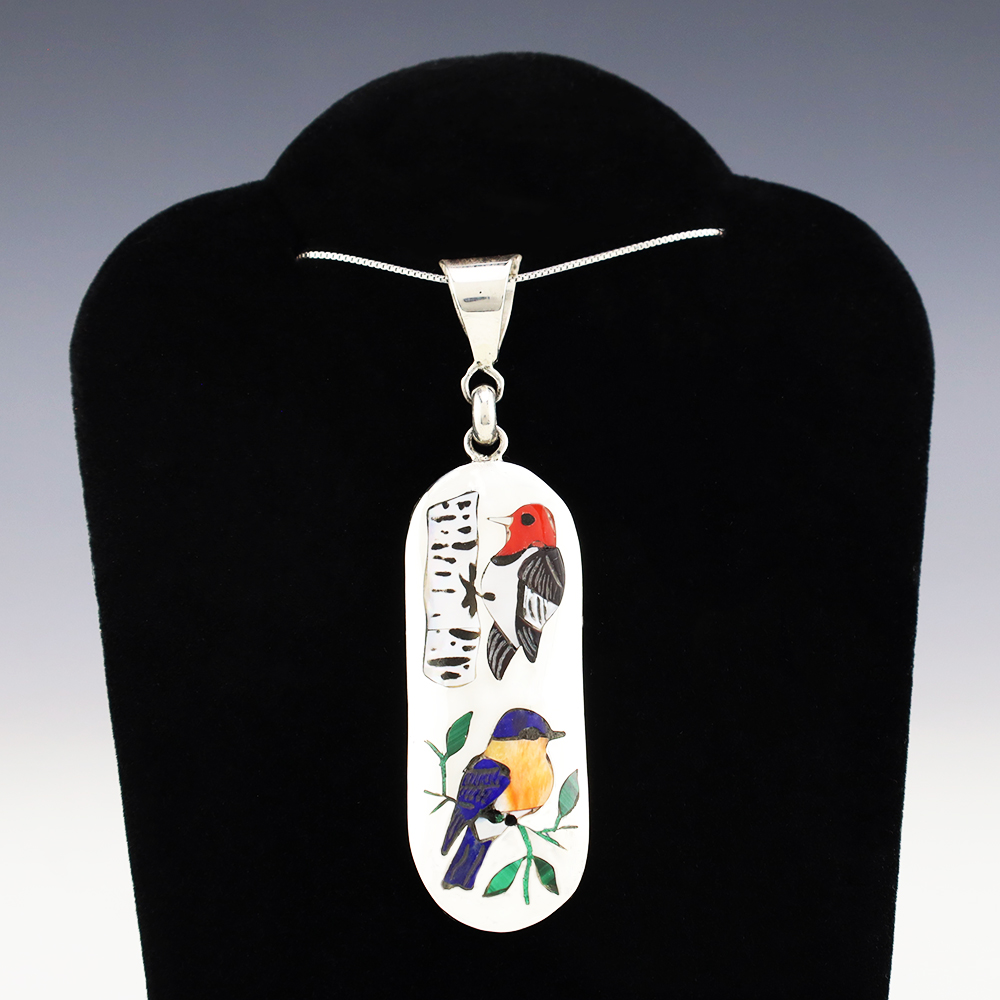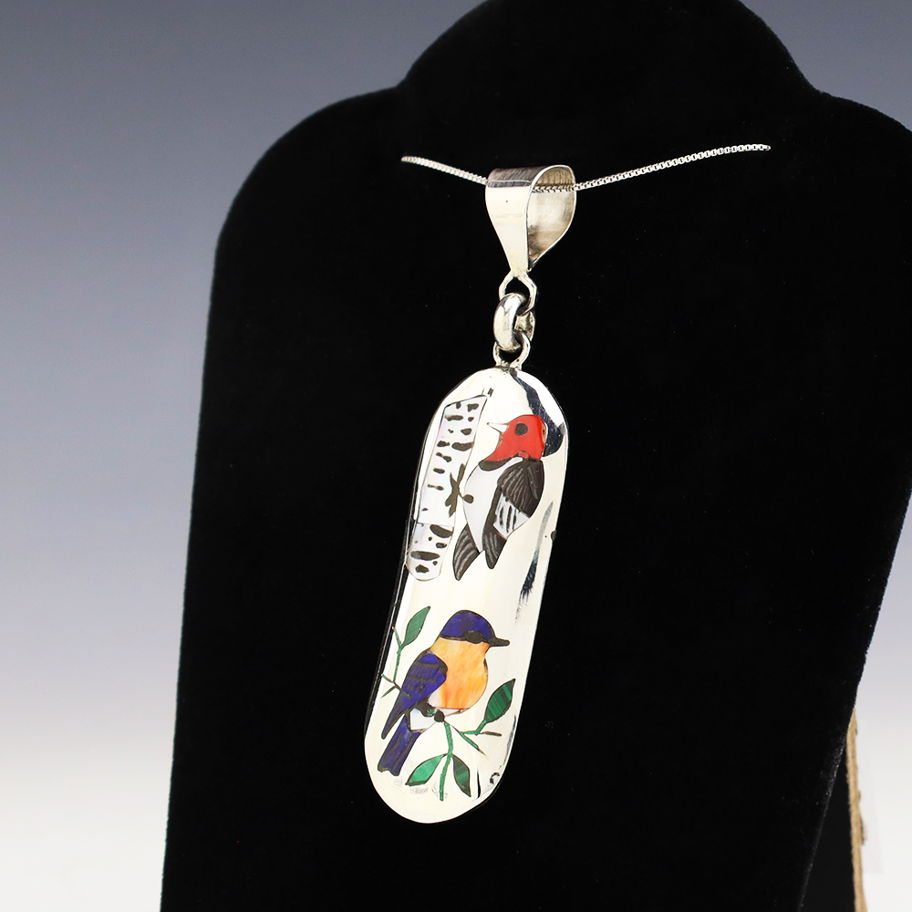 Zuni artist Quintin Quam hand made this beautiful pendant depicting a Woodpecker and an Eastern Blue Bird. The sterling silver pendant is intricately inlaid with Coral, Spiny Oyster, Penn Shell, Lapis, Jet, Malachite, and Mother of Pearl Shell. Amazing detail! Weighs 10 grams. (Chain not included) Signed