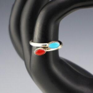 This ring is a great representation of hand made Navajo jewelry and will make a statement on your hand. Coral and Turquoise is set into a sterling silver setting. Weighs 2 grams. Size 8 and adjustable. 5/16″ wide The Navajos began working with silver in the 19th...