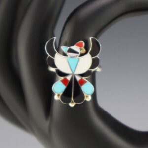 Zuni artist Breon Wallace made this fabulous Thunderbird ring. Zuni artists are known for their fine lapidary skills. Each stone is hand cut, polished, and set into a sterling silver setting. The ring is inlaid with Turquoise, Mother of Pearl Shell, Coral, and Jet. Weighs 4 grams. Size 7 1/4. ...