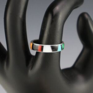 Zuni artists are known for their fine lapidary skills. Each stone is hand cut, polished, and set into a sterling silver setting. The ring is set with Mother of Pearl Shell, Jet, Coral, Spiny Oyster, Malachite, and Turquoise stones. Hand made by Zuni artist Rosewitha Ukestine. Weighs 2 grams. Size...