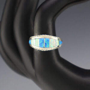 Zuni artists are known for their fine lapidary skills. Each stone is hand cut, polished, and inlaid into a sterling silver setting. The ring is set with Laboratory Opal stones. Hand made by Zuni artist Mirenda Peynetsa. Weighs 4 grams. Size 8 1/4. Signed Tapers-3/16″ to 7/16″ Artist...